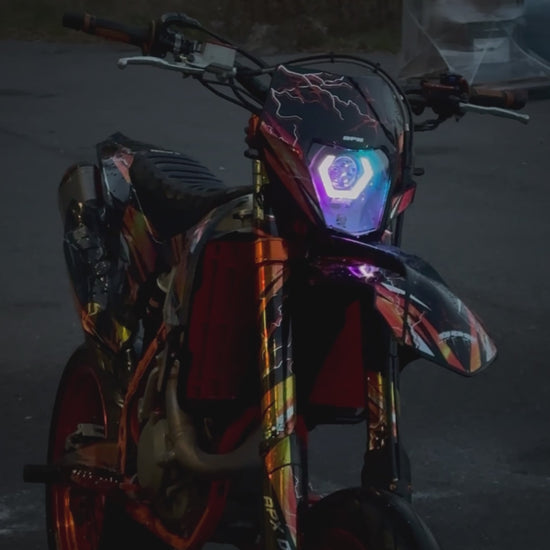 Transform every ride with the APX HEX PRO RGB Headlight, combining a striking hexagon RGB daytime running light with full app-control. At the center, a powerful 60W spotlight delivers unmatched illumination.